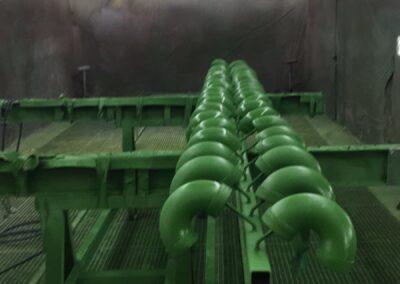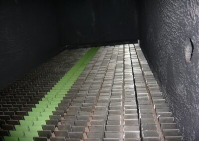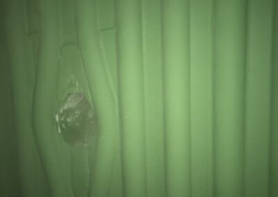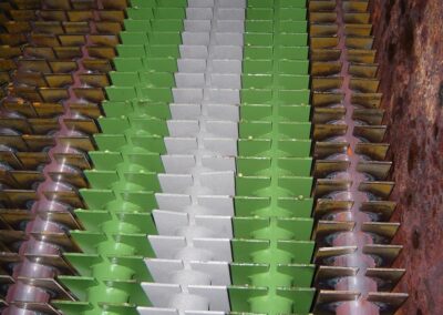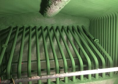 This highly emissive ceramic lining (RECHE) composed of an exclusive mix of ceramic and metallic additives is specially manufactured in order to offer a protection against erosion and corrosion, whereas it is improving heat transfer and thermal efficiency. The green colour of the lining allows to quickly identify the areas still protected and those which we have to keep an eye on. This means, identify the highly abrasion and corrosion areas before the tubes drill, and thus define an adequate maintenance planning.